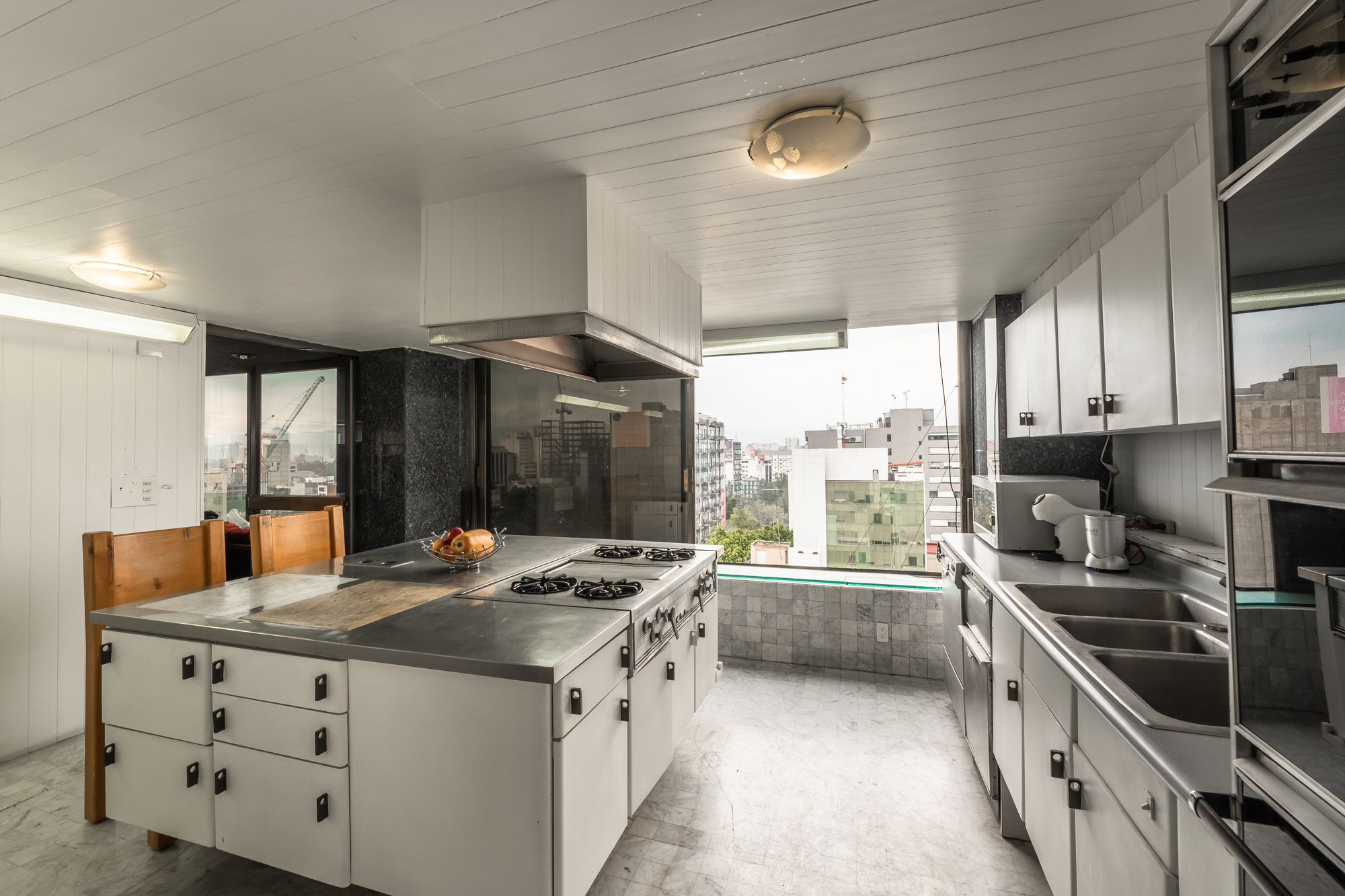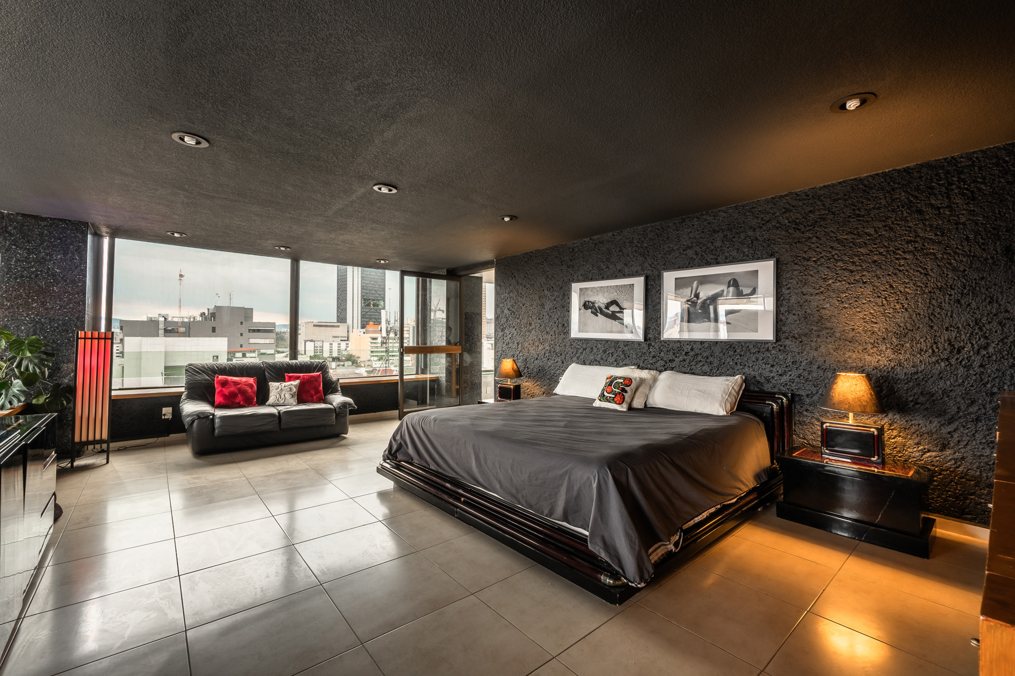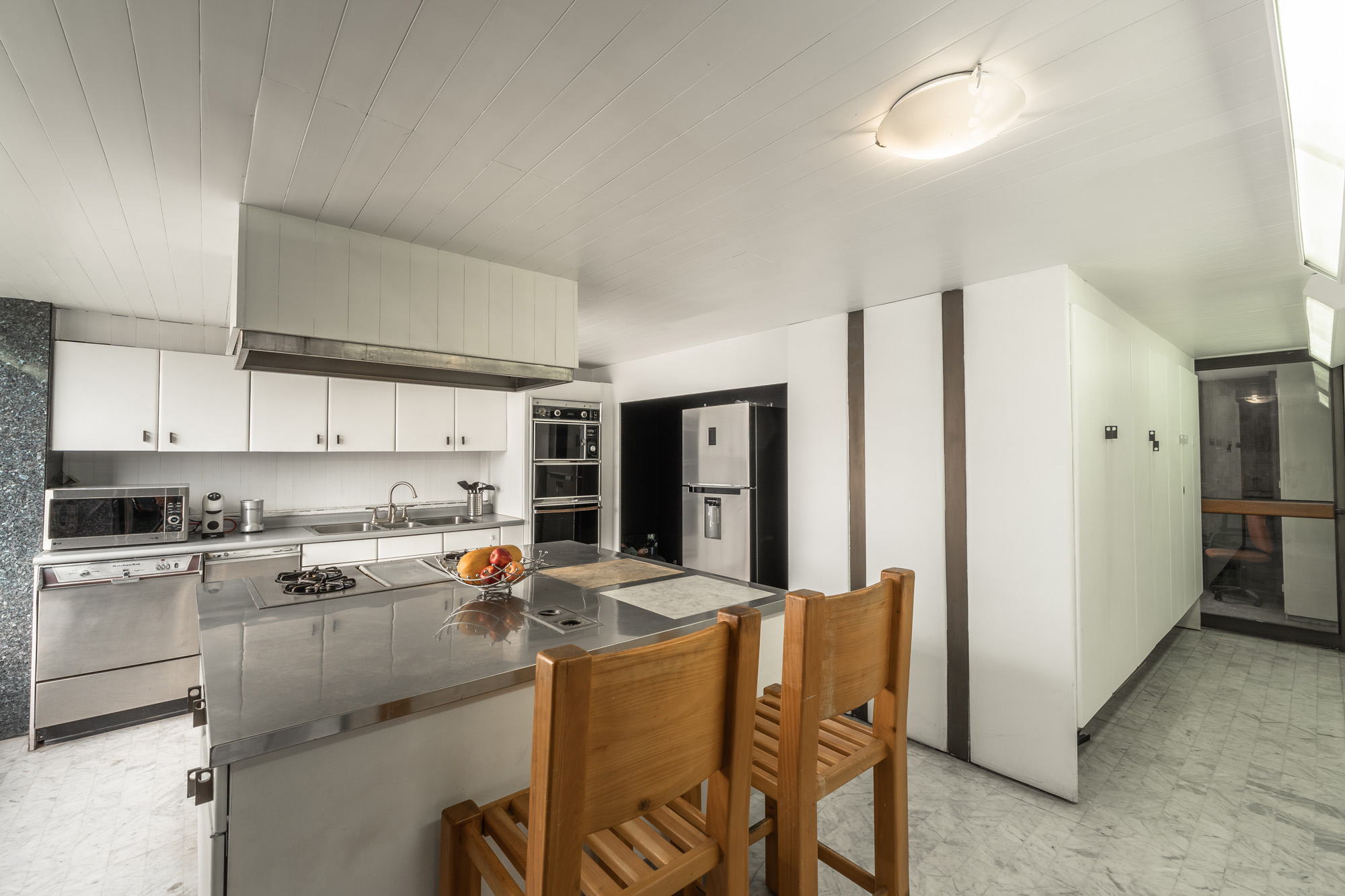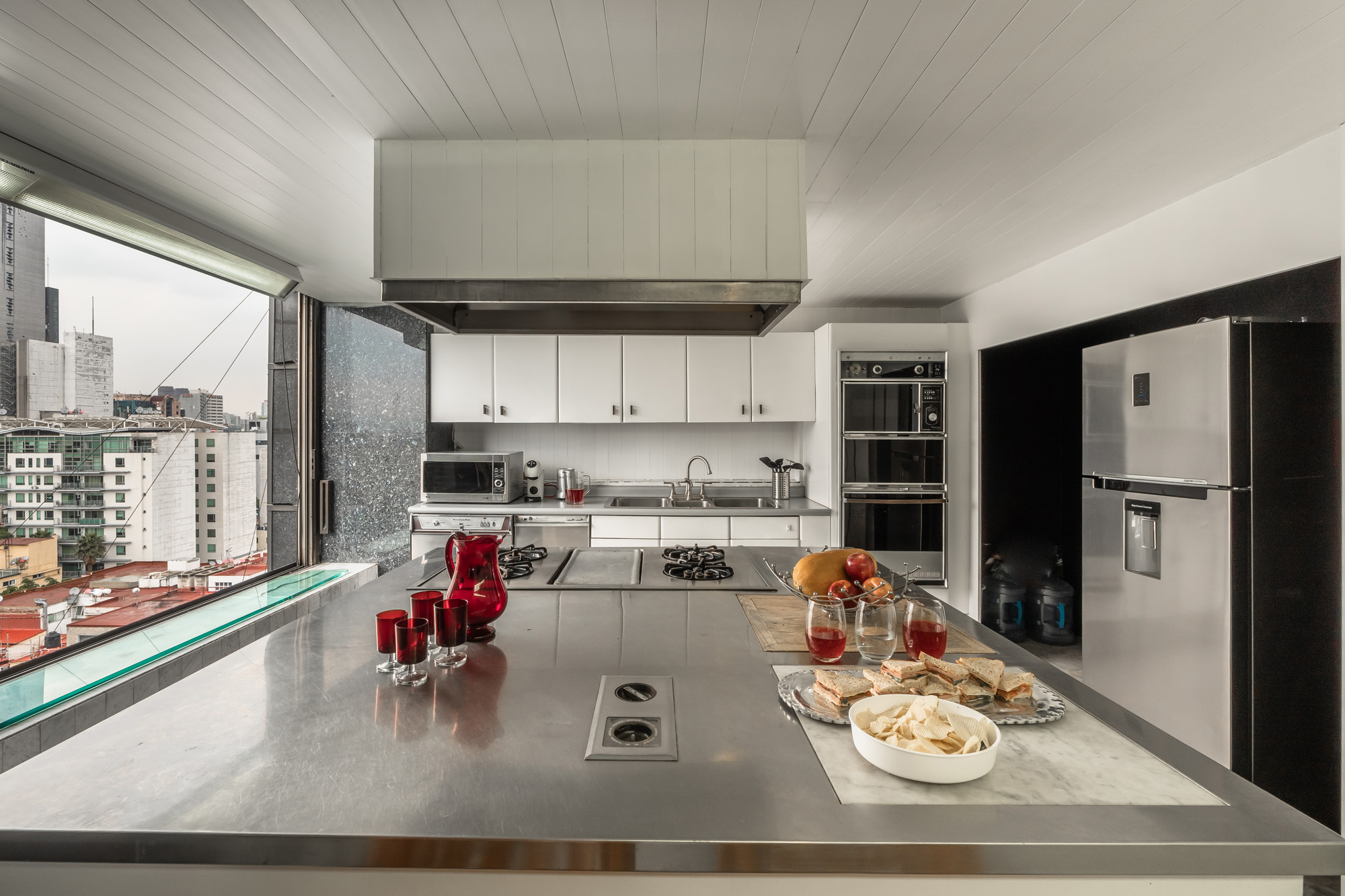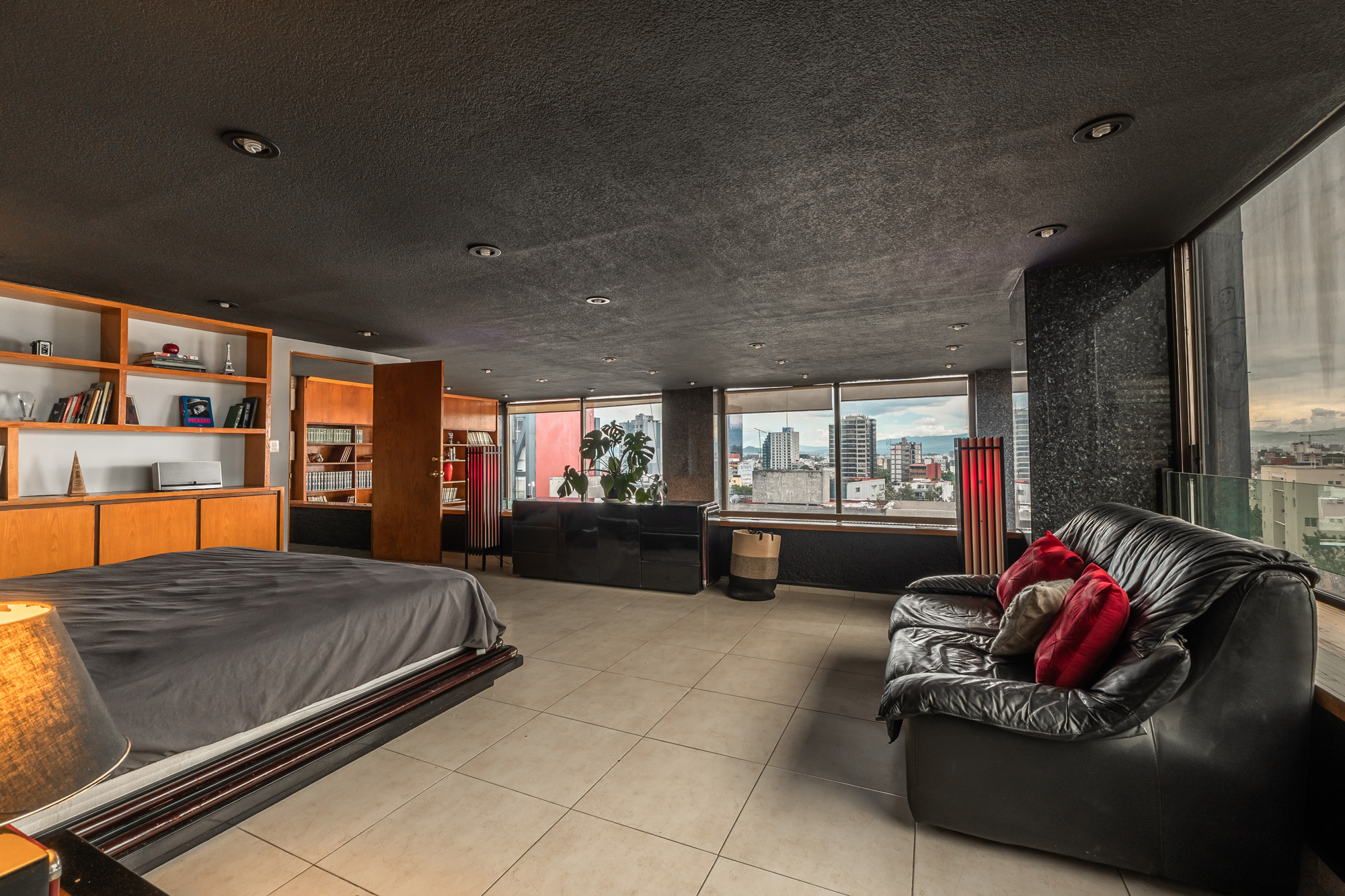 El segundo nivel, con 80m², incluye una habitación estilo setentero con una cama queen size, una estantería de madera y una cocina completamente equipada e iluminada. Además, la cocina cuenta con una espaciosa isla, lo que la convierte en un escenario ideal para tus sesiones fotográficas gastronómicas.